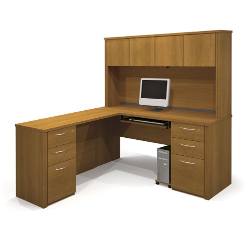 This gorgeous L-shaped desk comes with a great design, maximum desk top space, maximum storage, and pre-assembled pedestals! If time is a premium for you and you do not have time to be putting items together, the pre-assembled pedestals will certainly save you time. It is a part of Bestar's best selling Embassy Collection, and comes with premium finishes all the way around: a melamine-finished work surface to resist stains a scratches, two pedestals with drawers on ball bearing slides for smooth operation, and luxurious modern drawer handles. Its six total drawers offer more than adequate space for all of your files and office accessories. Whatever still needs to be stored will fit in the four generous private hutch cabinets. This desk literally has it all! It is also reversible, so that the hutch can be placed on either side of the desk to match with your office needs. This desk comes in a smooth cappuccino cherry and is sure to add elegance to any home office or work place environment! If you need even more storage for books or files, you can add on the optional bookcase or filing cabinet in matching finish (only at www.computerdesk.com)!