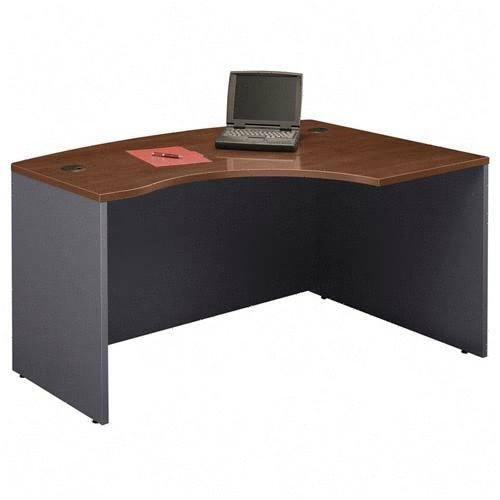 The refined Bush Corsa Series C L-Bow Desk offers you expanded workspace with minimal fuss. This L-bow desk is a grand and sturdy addition to any office suite, and will blend beautifully with any Corsa Collection piece. Features: Hansen Cherry finish with Graphite Grey sides and back Corner form with credenza base Accepts Universal or Articulating Keyboard Shelf L-Bow desk allows user to face approach side while keyboarding for greater privacy Accepts Right Return Desktop modesty panel grommets for wire management and cord concealment Made of fine MDF Durable PVC edge banding protects desk from bumps and collisions Made with exclusive Diamond Coat finish which is the result of breakthrough advancements in surface technology. One of the most durable surfaces in commercial office furniture, Diamond Coat features superior scratch, abrasion, and stain resistance with enhanced visual depth and clarity Specifications:Overall Dimensions: 29.8" H x 58.9" W x 42.9" D This product has been tip-tested and meets strict UL 1678 guidelines for load bearing. This ensures a safer and more durable product for your home or office. The American National Standards Institute (ANSI) and the Business and Institutional Furniture Manufacturer's Association (BIFMA) work together to produce voluntary standards that provide a common basis for evaluation of product safety, durability and structural adequacy. Bush Furniture meets ANSI,BIFMA standards and is considered appropriate in quality and durability to meet the demands of commercial office use. Cleaning instructions:Wipe clean with damp cloth and mild soap or dust with a soft cloth or paper towel dampened with household glass cleaner. Adhesive residue from factory-applied labels can be loosed with an adhesive or label removal product; remove all cleaner residues promptly with a damp cloth.