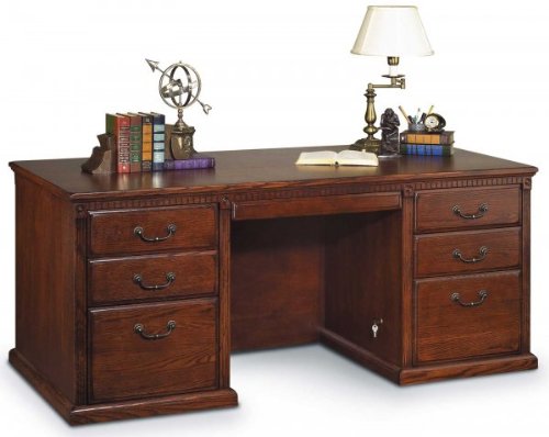Raise the tone of your home with the classic Huntington Oxford collection. Huntington lends your home an air of contemporary refinement, featuring sturdy hardwood construction in smooth cherry veneers, coated by a rich finish and lightly distressed for that antique luster. Select Huntington pieces feature heirloom-quality details such as old-fashioned hardware and detailed moldings for added high-class appeal. Features: 7 spacious drawersStandard form with double pedestal base Constructed from hardwood solids and veneers Distressed burnish finish Full suspension ball bearing glides Precision channel joint construction Two letter file drawers Right-hand file drawer locks Four utility drawers - two have dividers One pencil drawer Finished back with conference overhang Sides are finished, allowing the desk to be used in the center of the room. Two cable access holes for wire managementNo assembly required 10 year manufacturer warranty Specifications: Overall dimensions: 29" H x 68.25" W x 31.75" D Weight: 256 lbs